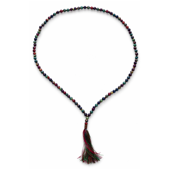 El diseño del mala destaca por la belleza de sus cuentas, que muestran el contraste natural entre el verde vibrante y el rosa rojizo del rubí. Esta unión ayuda a fortalecer la energía interior y favorece la concentración, convirtiéndolo en una herramienta ideal tanto para la meditación como para llevar como un amuleto de equilibrio personal y transformación.