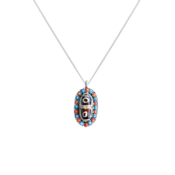El colgante presenta una piedra DZI, reconocida por sus características marcas en forma de ojos y líneas que simbolizan la apertura del tercer ojo, la energía espiritual y la protección. Desde la antigüedad, estas piedras han sido consideradas poderosos amuletos capaces de atraer bienestar, equilibrio y protección astral.