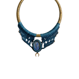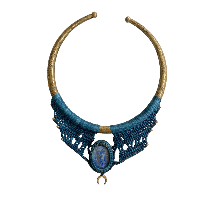 El diseño está cuidadosamente elaborado con macramé y detalles decorativos que enmarcan una piedra natural de lapislázuli situada en el centro. Esta piedra se convierte en la protagonista del collar, aportando un intenso color azul que hace que la pieza destaque con gran elegancia.