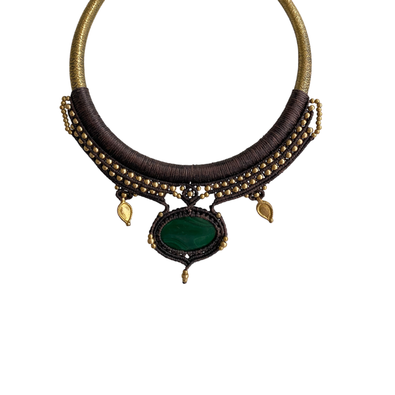 El diseño está cuidadosamente elaborado con macramé y detalles decorativos que enmarcan una piedra natural de malaquita situada en el centro. Su intenso tono verde y sus características vetas aportan un toque armonioso y lleno de fuerza, convirtiéndose en el elemento protagonista de la pieza.